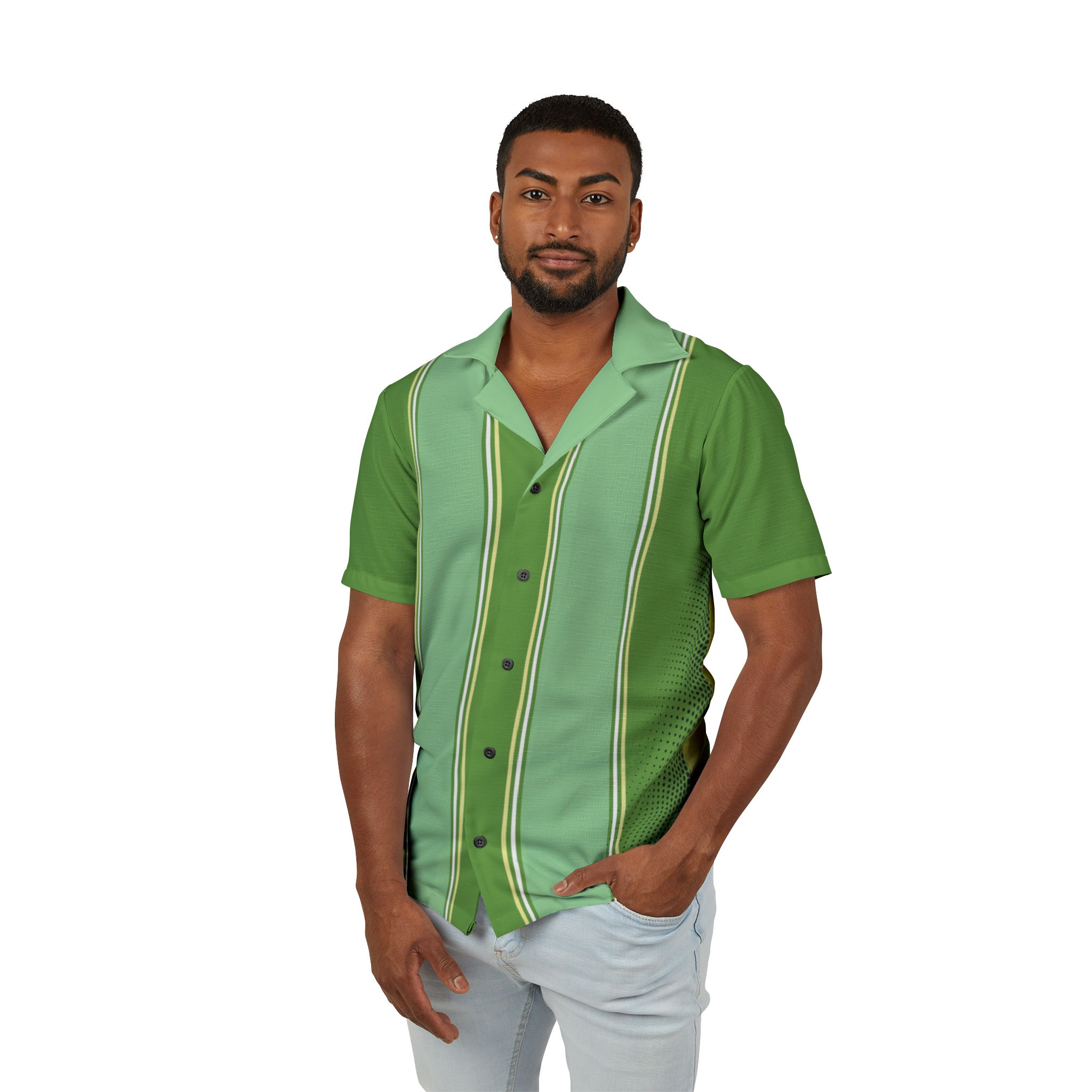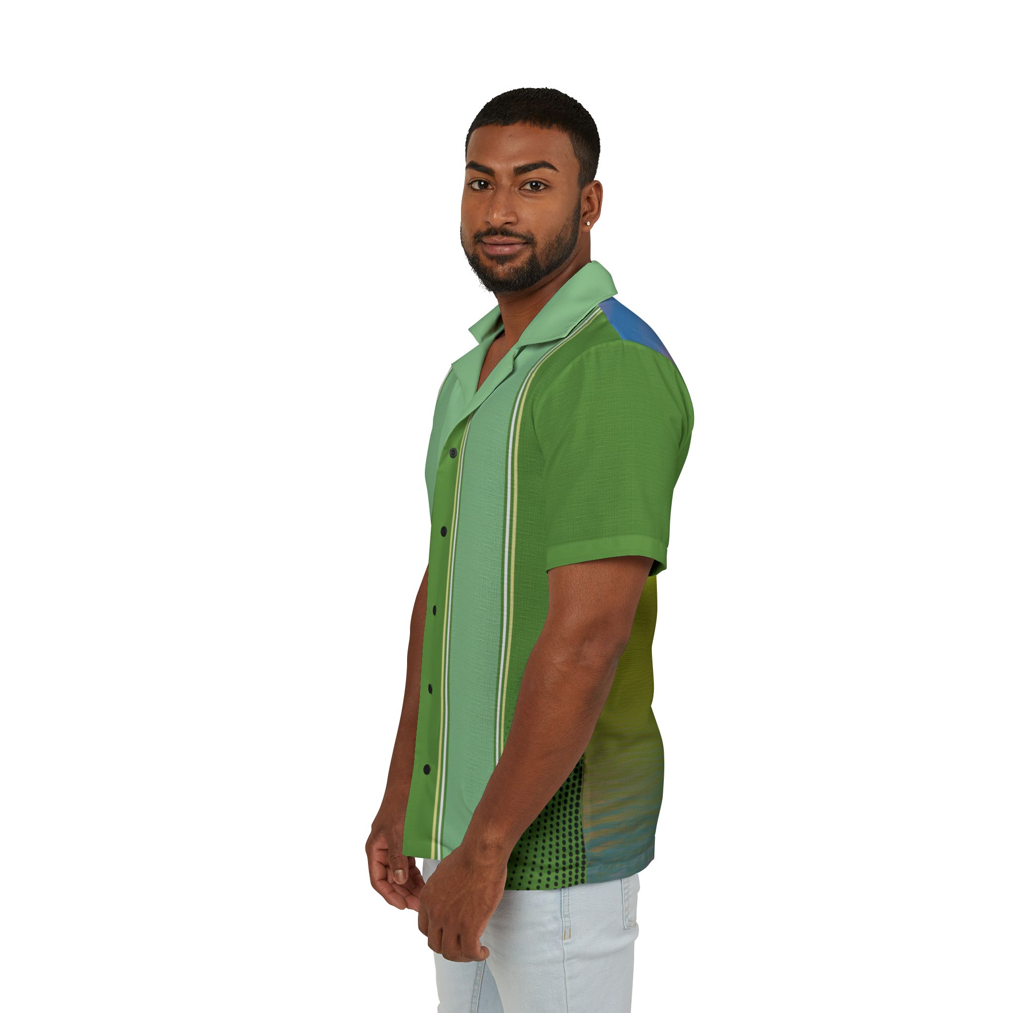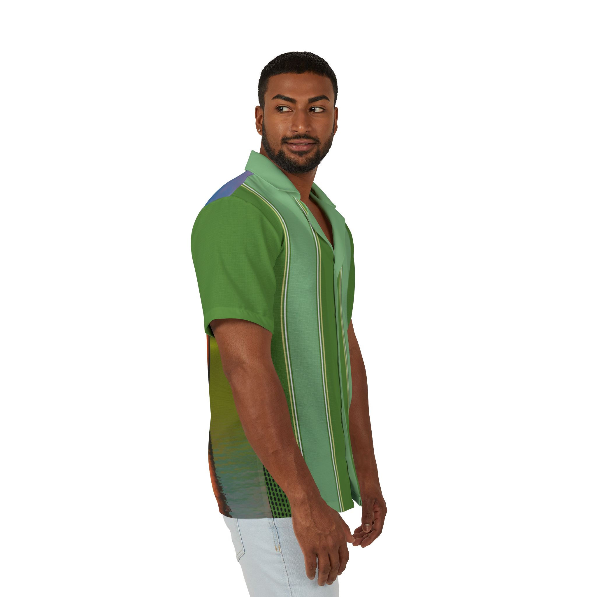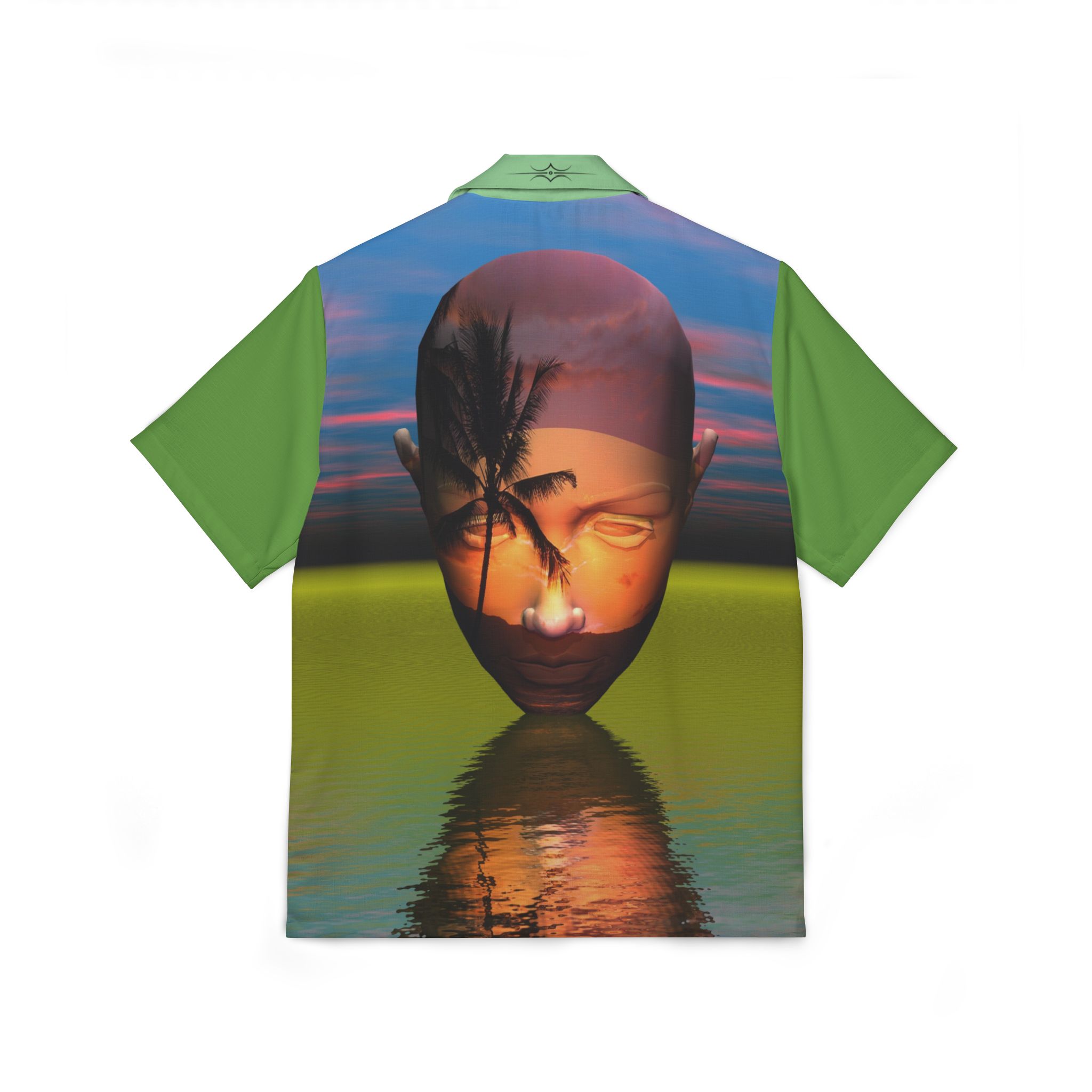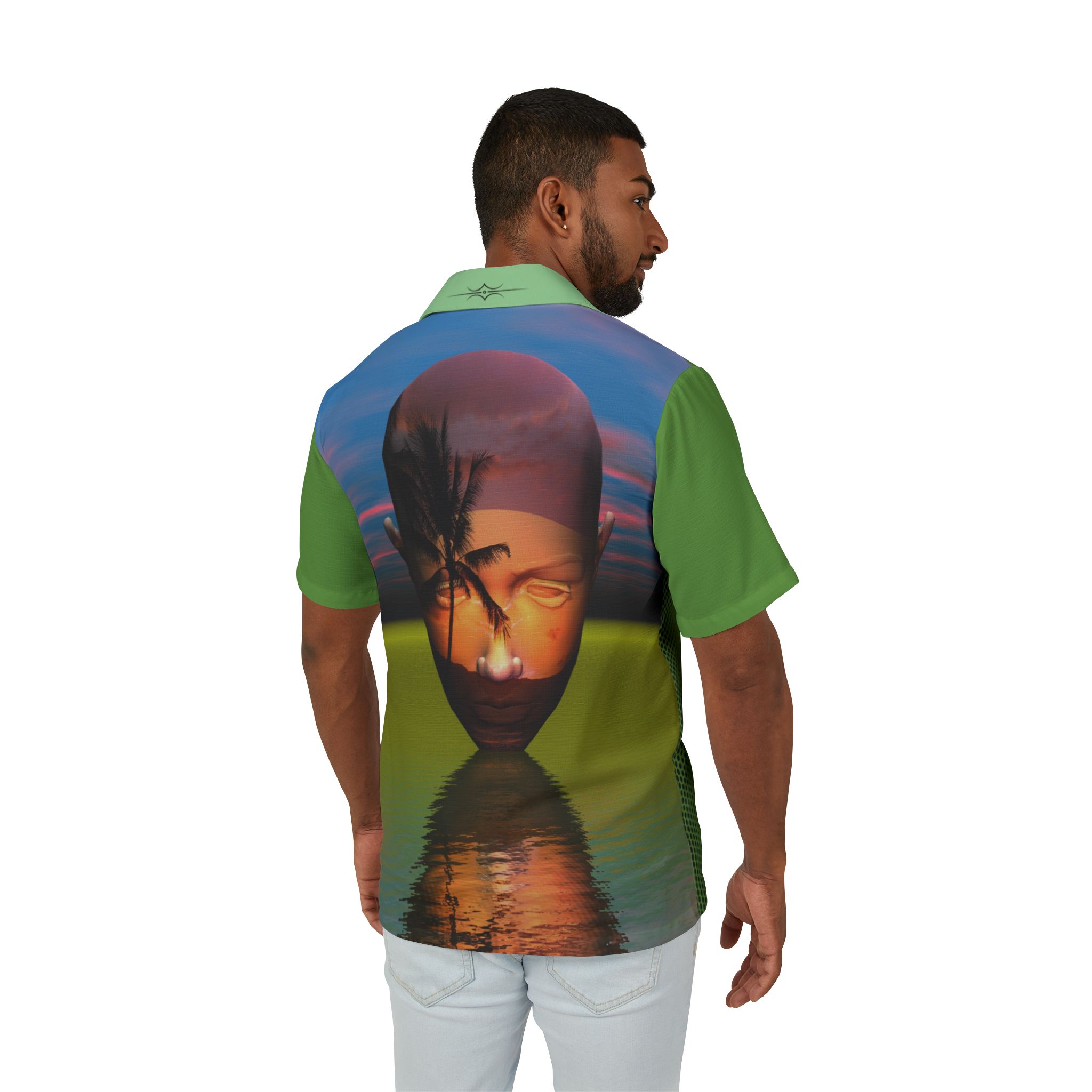 Men’s Button Up – MIND ISLAND SUNRISE – Teal Green – Classy Casual Sharp Surreal Hawaiian Bowling Camp Shirt – Master Minds Series