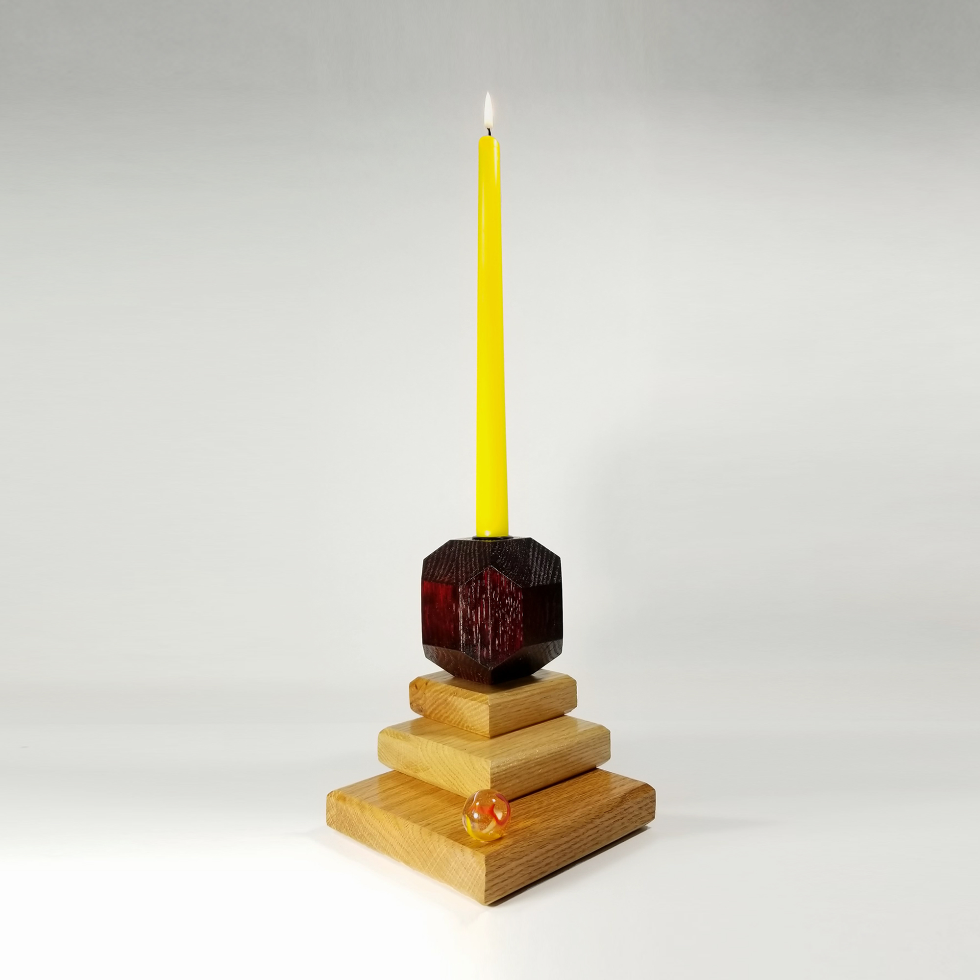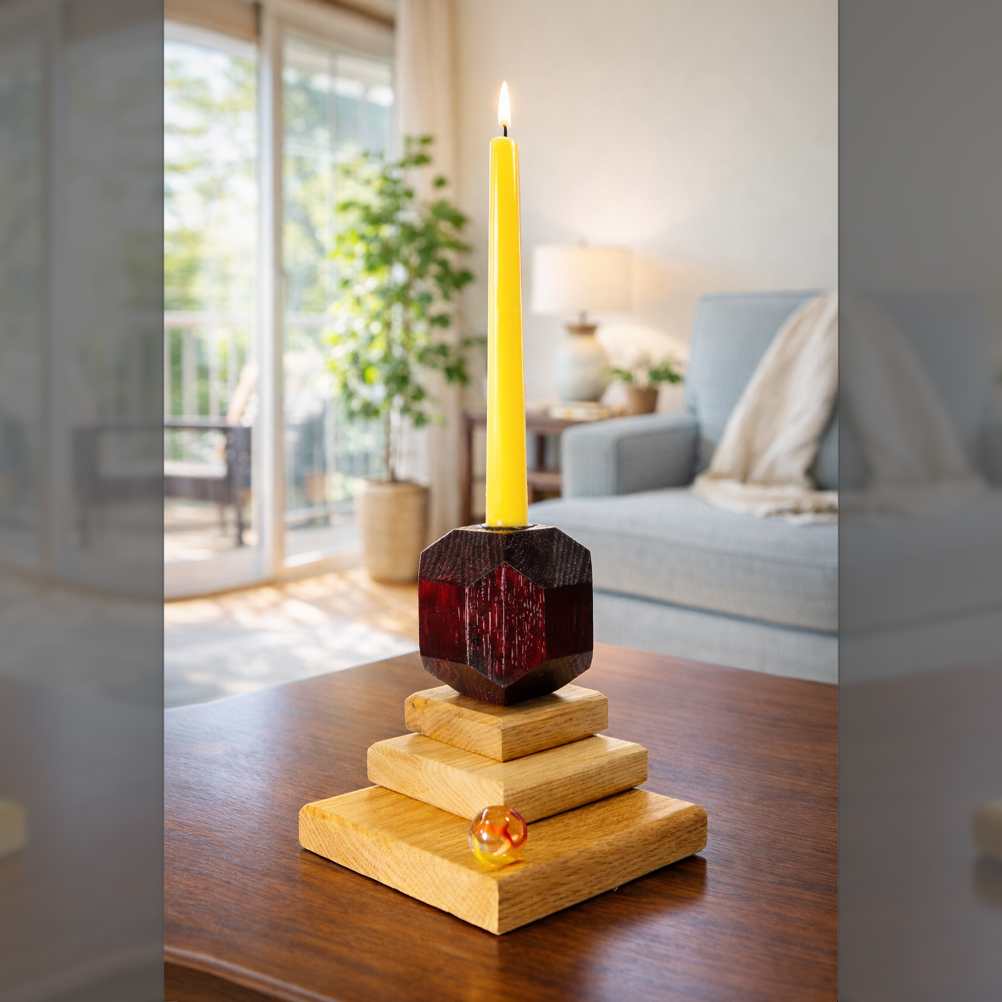 The angled foundation shifts the candlestick from purely vertical to quietly dynamic, inviting light to interact with the facets, grain, and shadow in new ways. Small inset details are integrated into the base, allowing space for glass marbles or personal objects, transforming each piece into a functional altar—part display, part contemplative object.