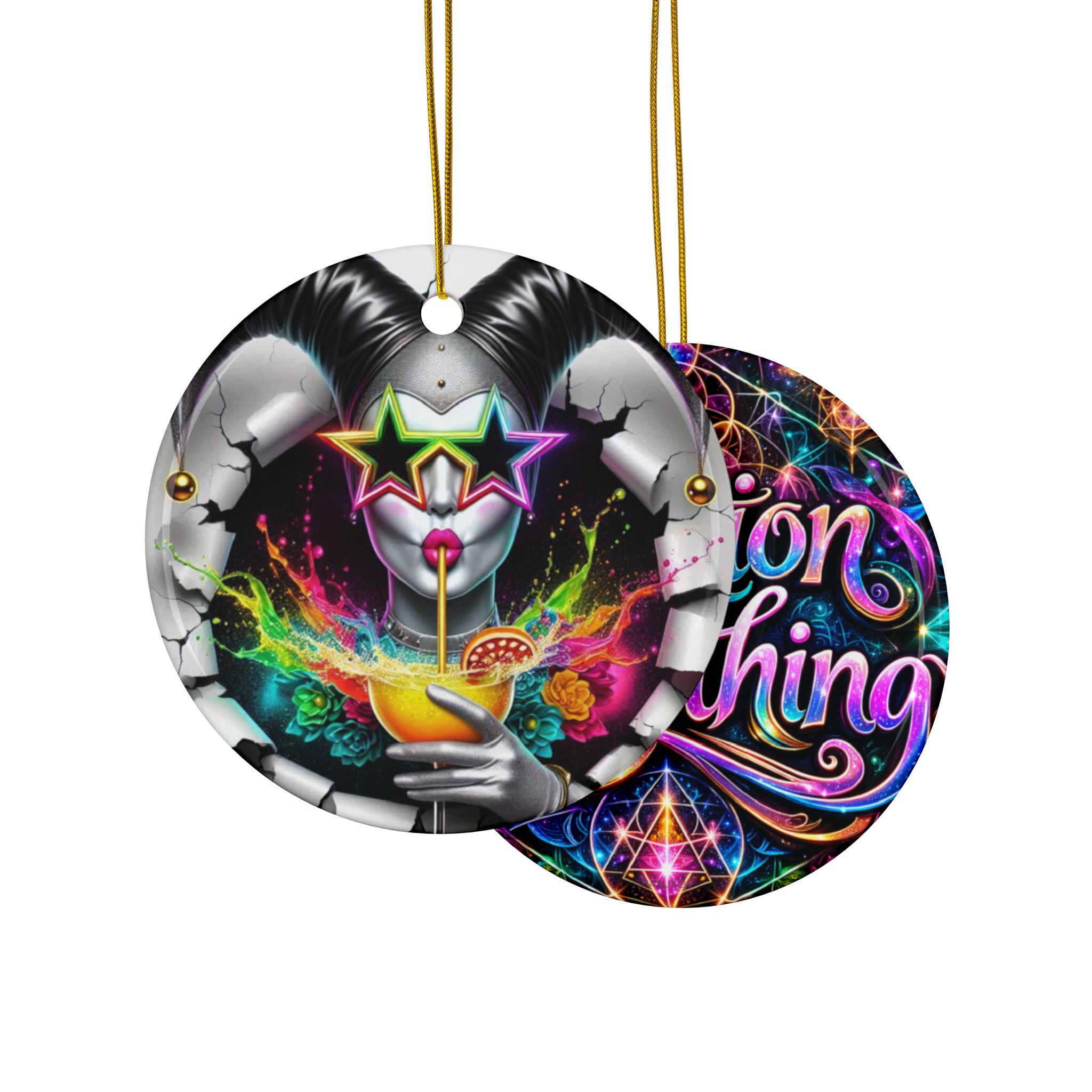 With a smooth glossy finish and vibrant double-sided artwork, these ornaments bring a bold artistic presence to any setting—whether displayed in your home, studio, office, or creative sanctuary. Crafted from 100% ceramic and finished with a gold hanging string, they offer a refined way to showcase visionary art in a compact, collectible form.