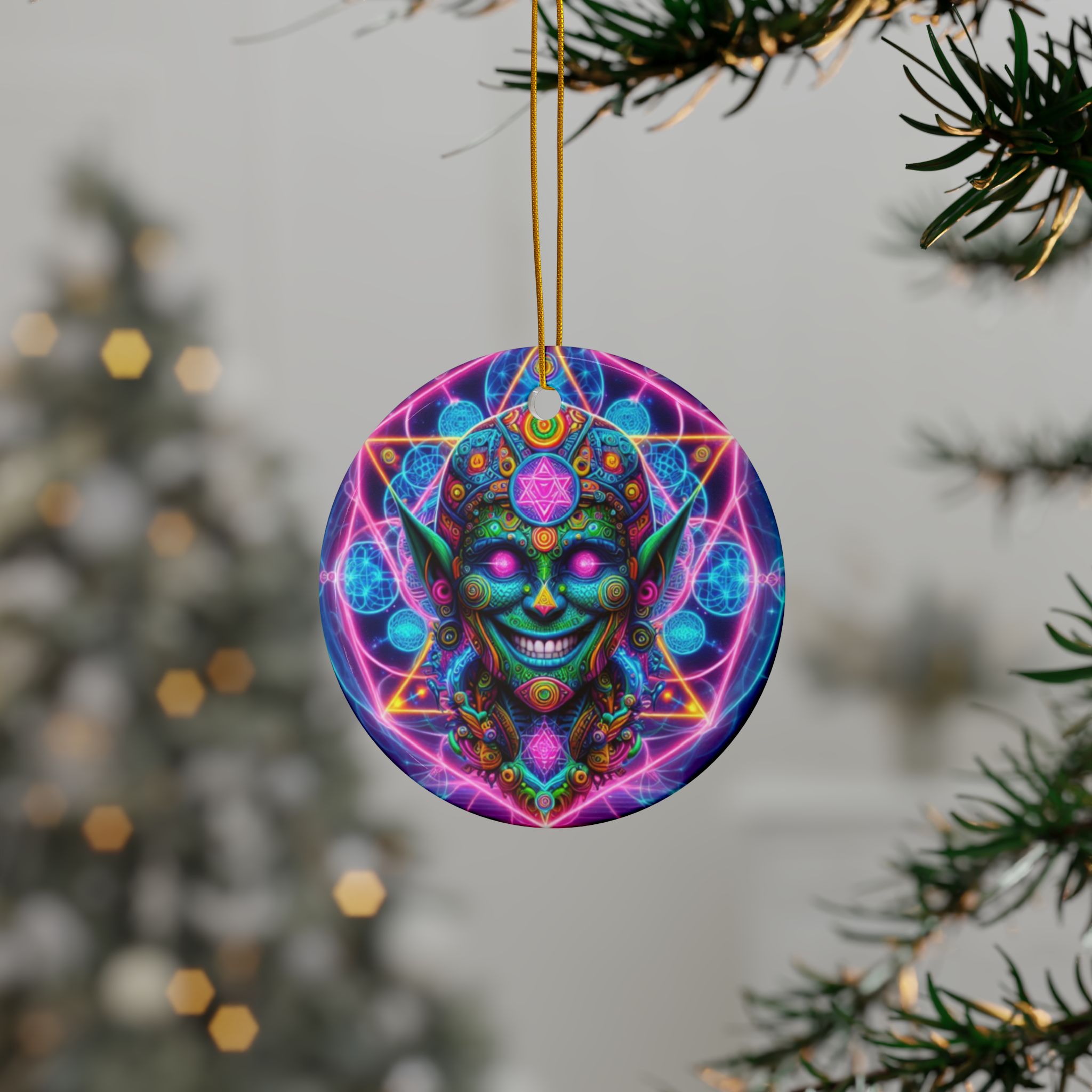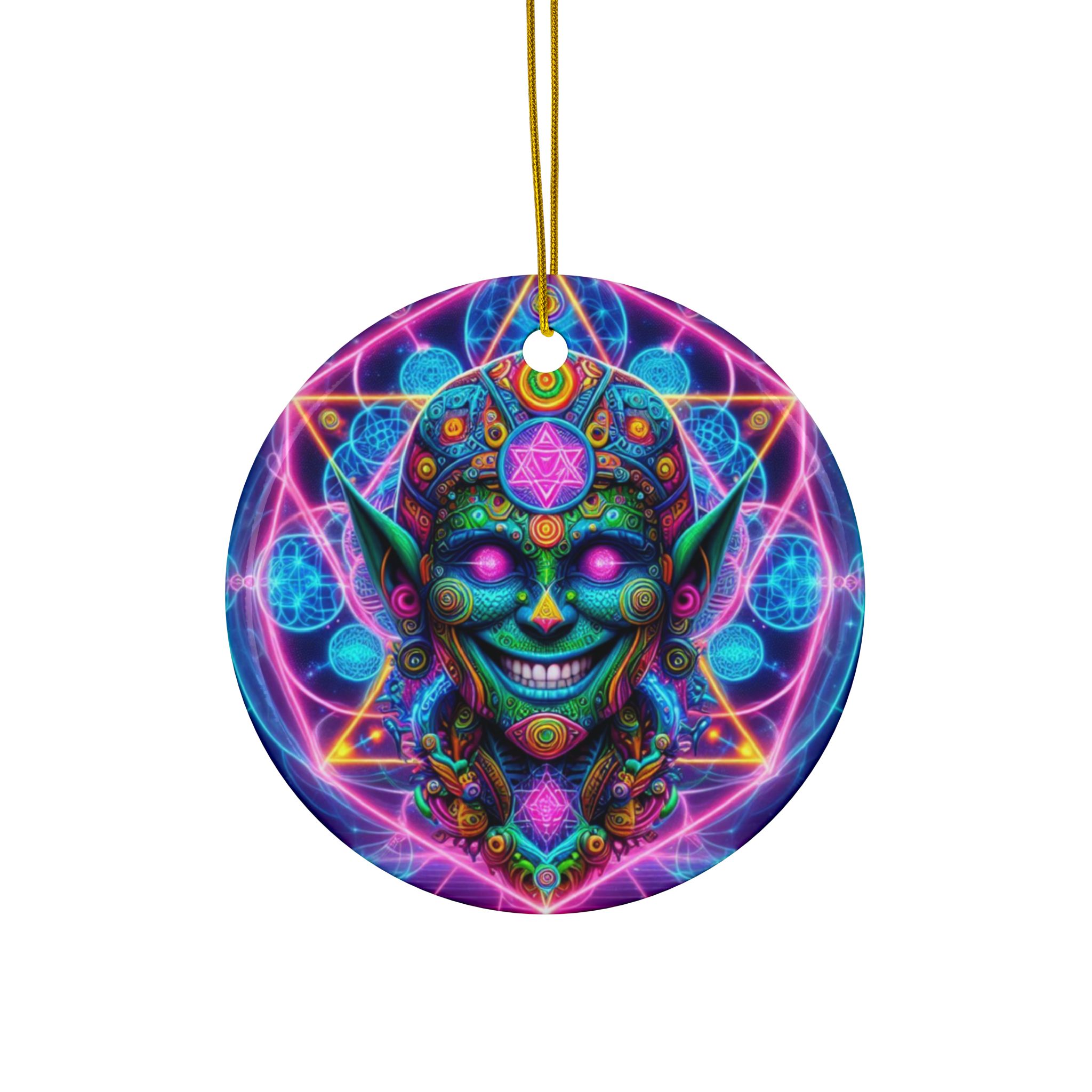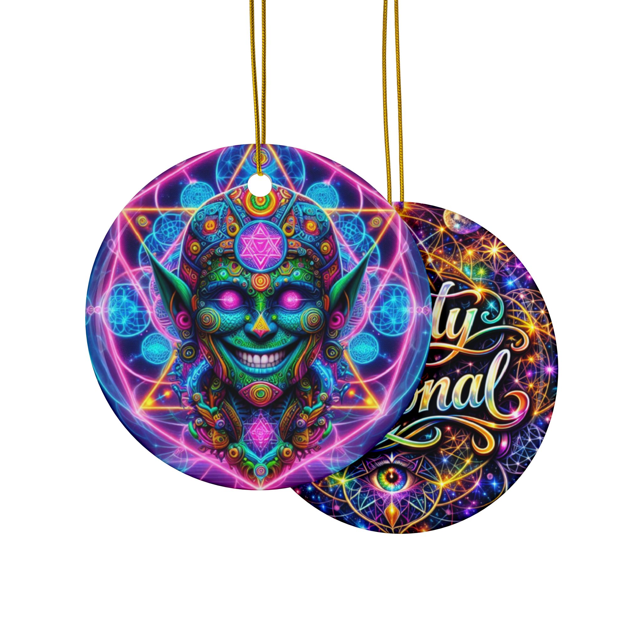 With a smooth glossy finish and vibrant double-sided artwork, these ornaments bring a bold artistic presence to any setting—whether displayed in your home, studio, office, or creative sanctuary. Crafted from 100% ceramic and finished with a gold hanging string, they offer a refined way to showcase visionary art in a compact, collectible form.