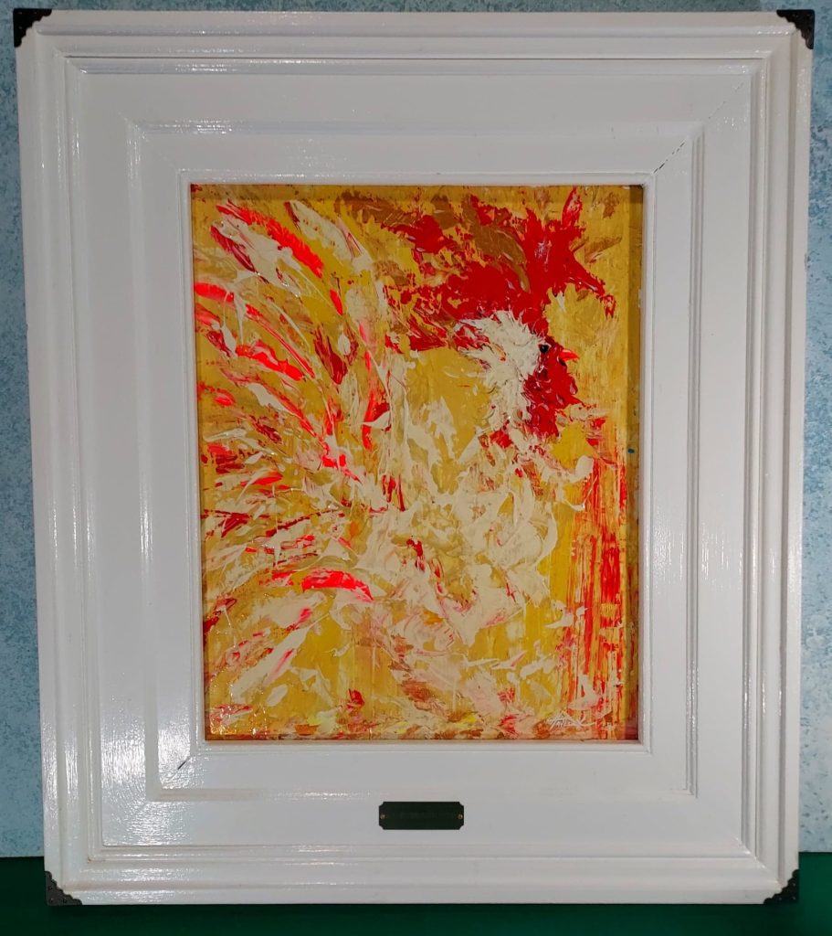 This is not barnyard realism—this is symbolic ignition. The rooster, long a universal emblem of dawn, vigilance, and rebirth, becomes here something greater: a cosmic signaler, crowing not to the morning sun, but to the awakening mind. Every brushstroke pulses with urgency—alive, expressive, unapologetically bold—capturing that fleeting moment where darkness fractures and light pours through.